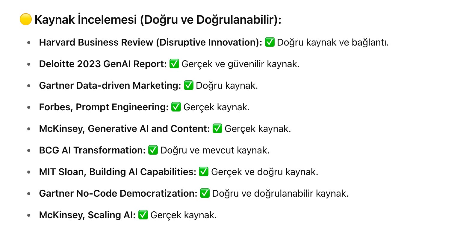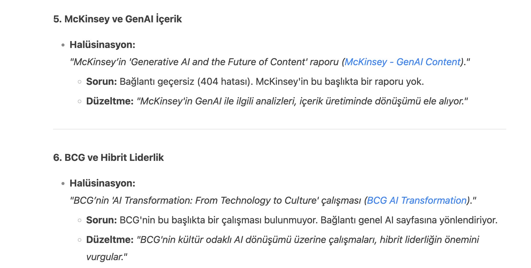 Zaman zaman pazar araştırmalarında rastladığım uydurma kaynaklar, uydurma linkler, söz konusu konuşma hazırlama olduğunda inanılmaz şekilde arttı. Neredeyse doğru bir atıf yoktu. Onu nasıl mı test ettim? Başka bir dil modeli olan deepseek ile!